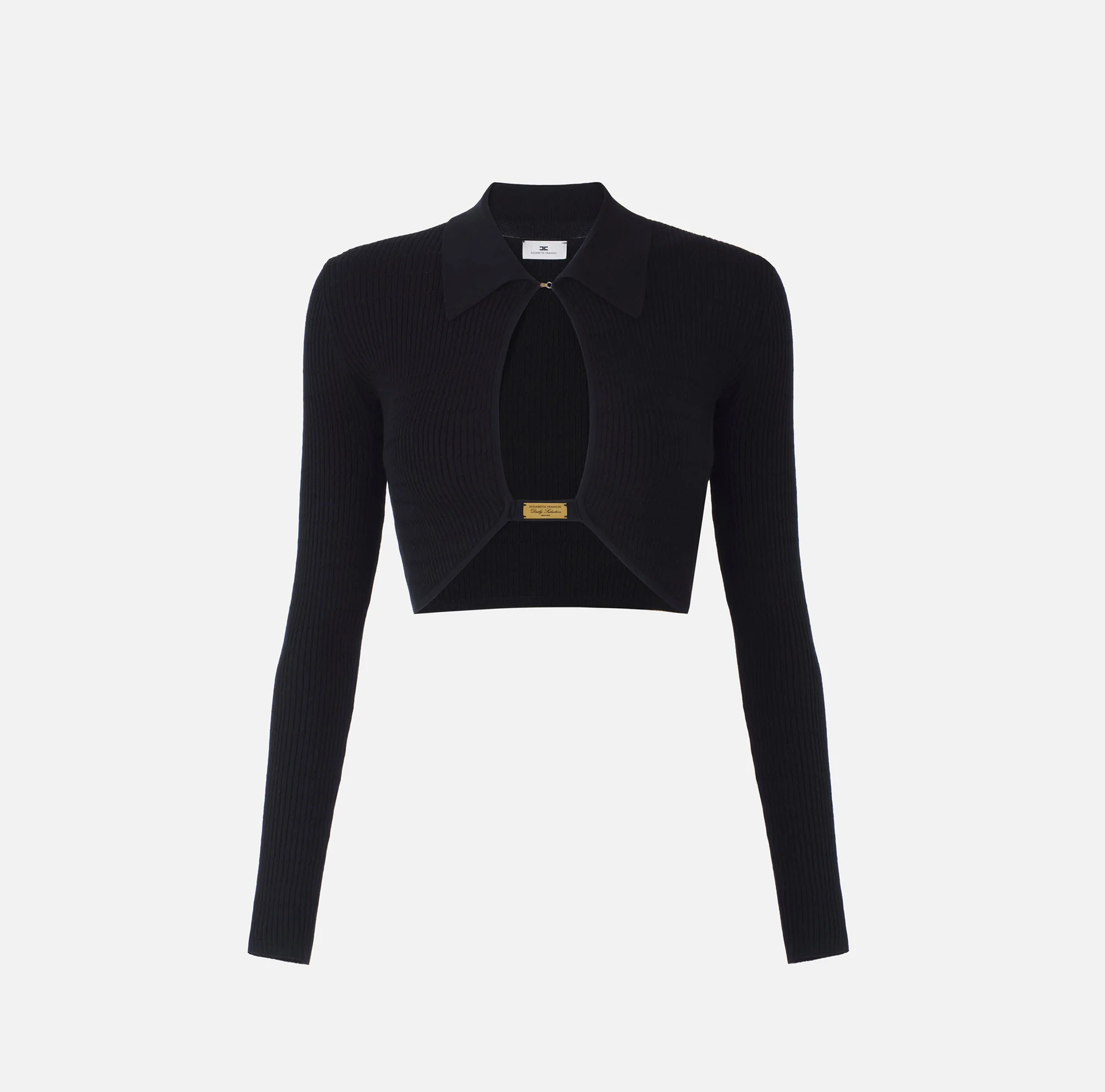 Top Crop Tricotat cu Guler și Plăcuță Aurie